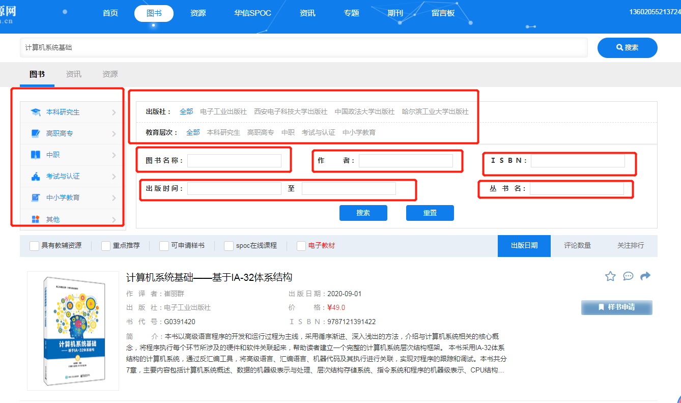 在此页面上,可对电子游戏官网总平台 名称,isbn号,丛书名,出版时间,还有电子游戏官网总平台 所属教育层次进行查询。现在显示的是我方法1的查询结果。