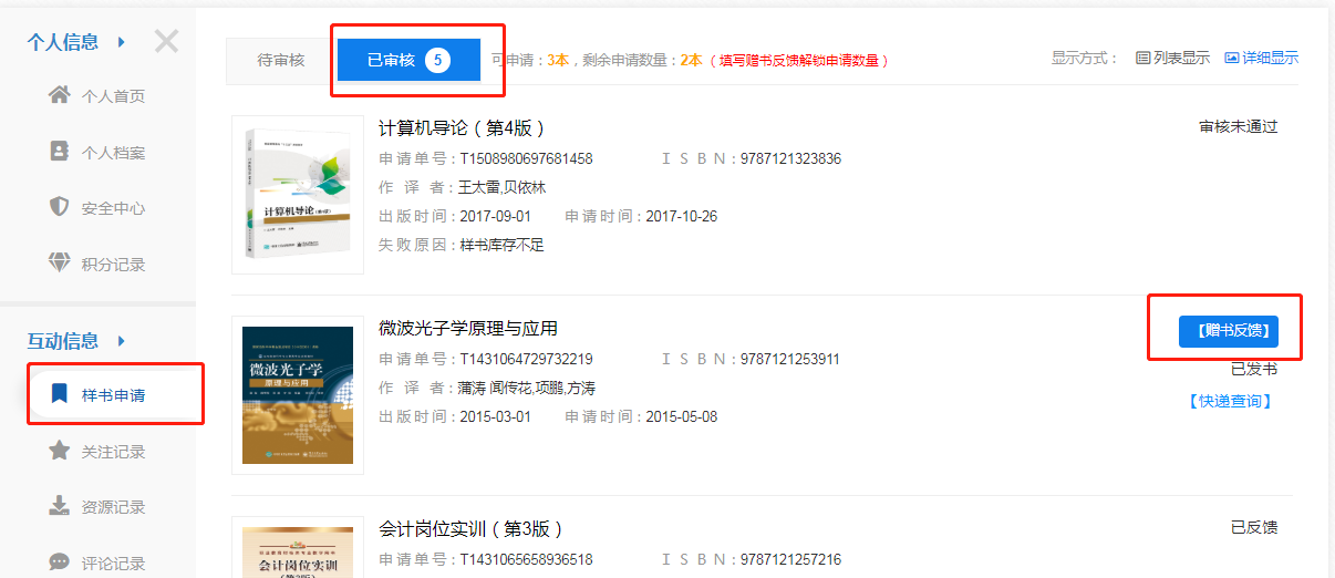 第二步:点击左侧菜单‘样书申请’,在‘已审核’列表找到要填写赠书反馈项。