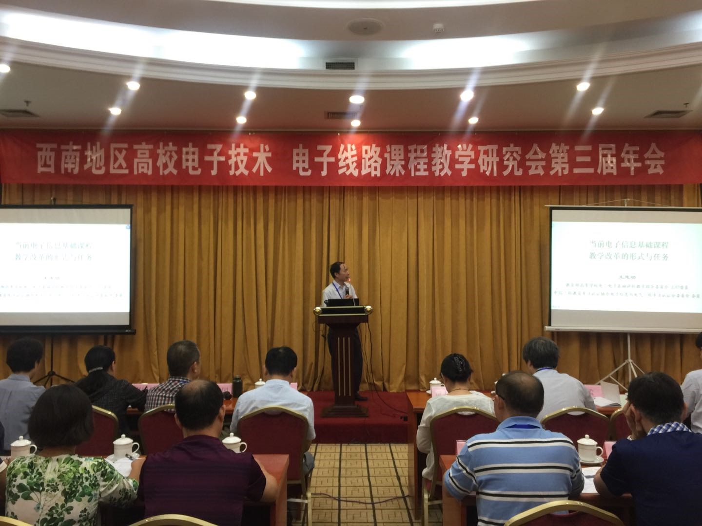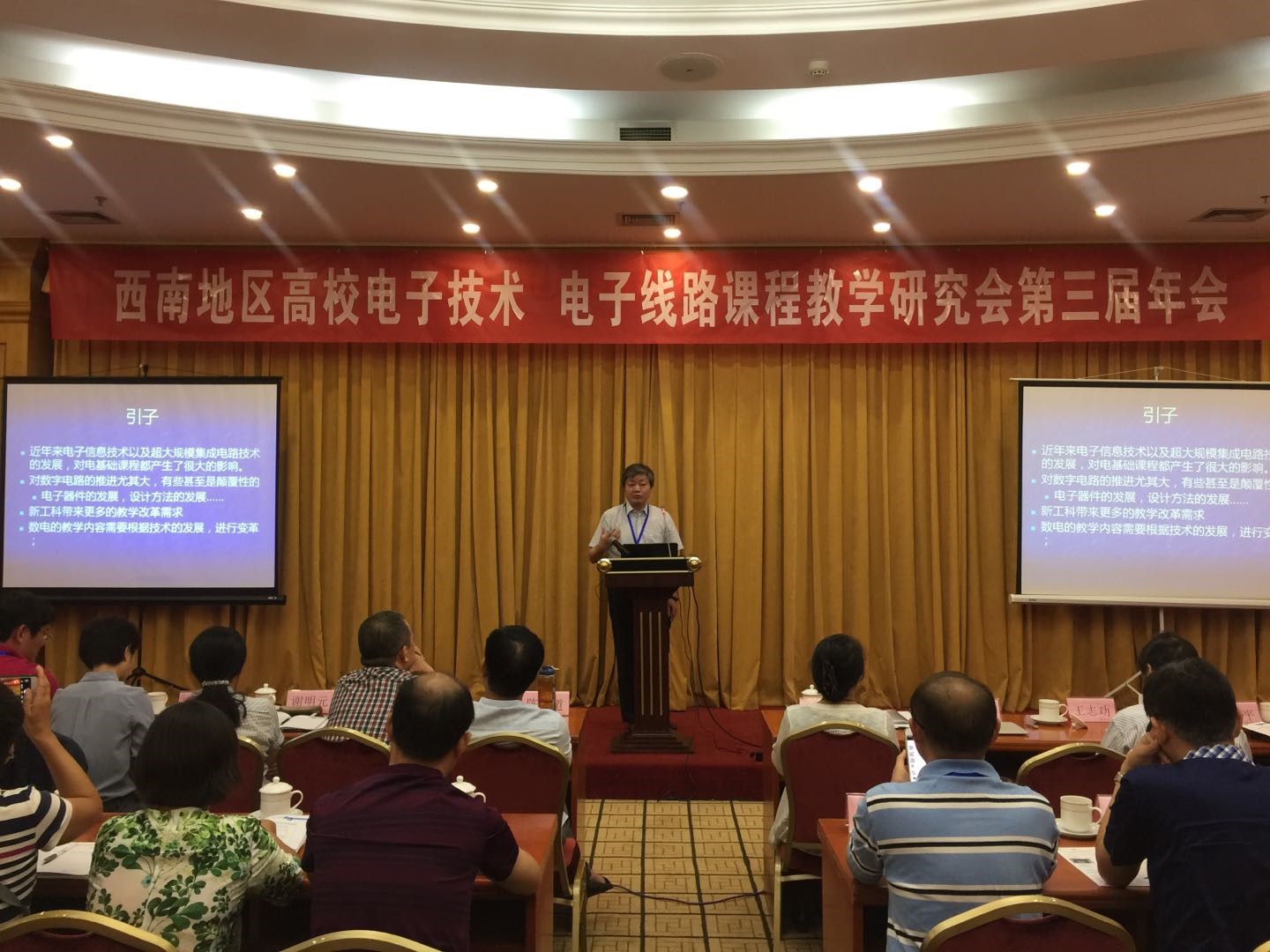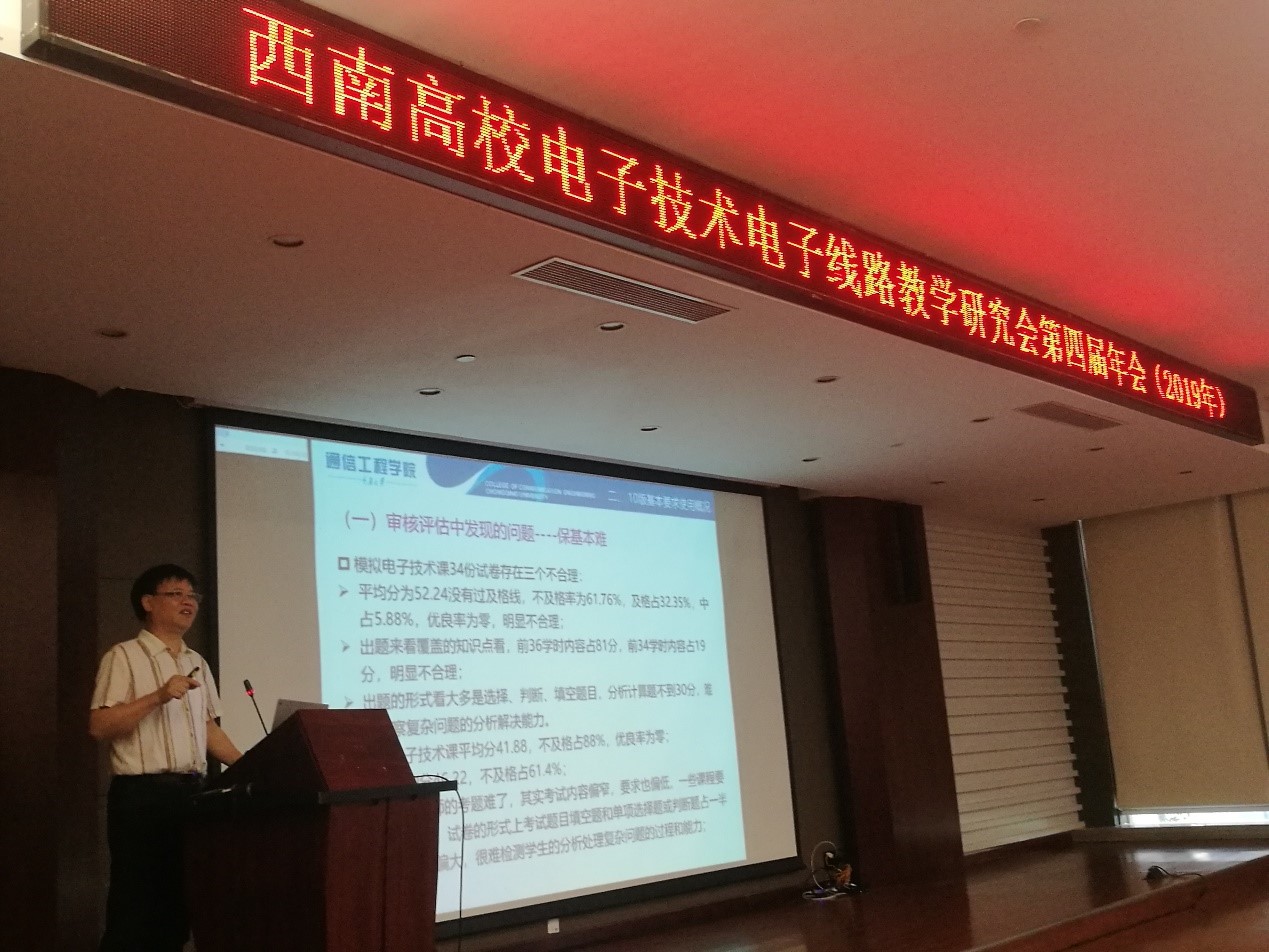 研究会于20160824日在成都正式成立并召开了第一届年会,教育部高等学校“电工电子基础课程教学指导委员会”主任王志功教授录制了贺词,邀请了清华大学电子技术资深教授华成英老师,西安电子科技大学原副校长、模拟电子线路课程资深专家傅丰林教授,教育部高等学校电工电子基础课程教学指导委员会秘书长、东南大学孟桥教授,厦门大学施芝元教授等做了精彩报告。201720182019年分别在重庆、昆明、贵州召开了第二、三、四届年会,先后邀请了教育部高等学校电工电子基础课程教学指导委员会主任、东南大学王志功教授、教育部高等学校电工电子基础课程教学指导分委员会副主任,西南地区高校电子技术电子线路研究会理事长、重庆大学曾孝平教授,南京大学庄建军教授、清华大学王红教授、全国高等学校电工学研究会理事长、重庆大学侯世英教授、浙江大学陈隆道教授等做了主题报告。四川大学周群教授、电子科技大学黄乐天副教授、重庆邮电大学何丰教授、西藏农牧大学李朝霞教授等做了专题报告。在年会前和年会后,还开展了产学合作教师师资培训,并颁发了培训证书。四届年会都取得了圆满成功。